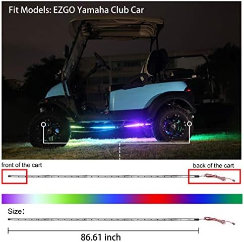 Fit Models: This Golf Cart Underbody Glow Christmas Decorative LED Lighting Kit is for EZGO Yamaha Club Car, compatible with any Electric or Gas Powered Golf Cart (12V-72V). Includes (2) 86.62″ Light Strips. Others seller’s is only 20-24″.