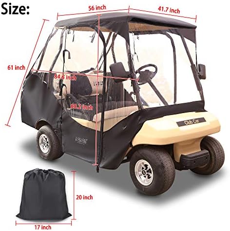 Fit most 4 Passenger Club Car DS cart. 84.6inch in length, 41.7inch in width and 60.2inch in height. Separate rear panel for club access. Due to the height of the cover, the child sit in the back will better.