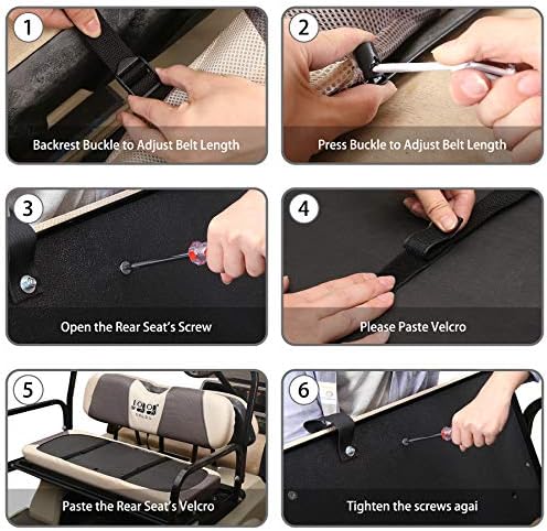 Plug-N-play design with bulks and belt. golf cart back seat covers Two straps on each cover,even have a bungee cord to tighten it.The elastic in the seat cover facilitated perfect fit, especially on the corners. The adjustable tightening straps, under the seat, ensures a tight fit a the front and back.(the back seat tool a little extra effort to get it tight, had to remove seat, pull tight and then cut small holes where bolts would reenter )