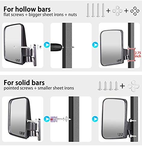 10L0L golf cart folding side mirrors includes all hardware for installation. Mirror folds back upon impact to keep the mirror from breaking, The distance between the two screws is: 2.75”