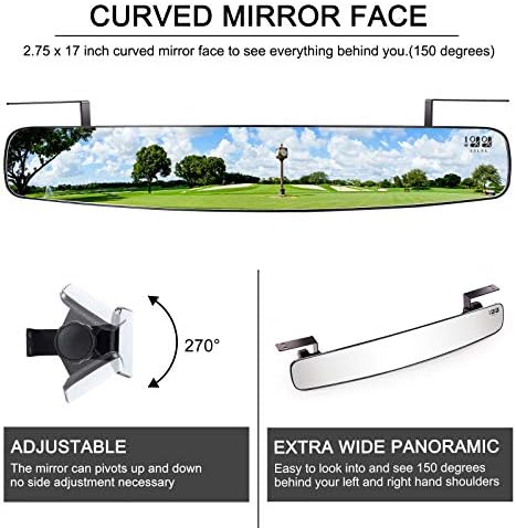 10L0L Golf Cart Rear View Mirror with the large extra wide panoramic, 2.75 x 17 inch curved mirror face to see everything behind you. Easy to look into and see 150 degrees behind your left and right hand shoulders.