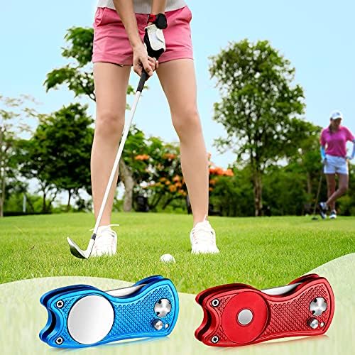 2 Pieces Golf Divot Repair Tool Stainless Steel Foldable Golf Repair Tool Magnetic Golf Ball Marker Tool with Pop Up Button Portable Golf Pitchfork, Red and Blue