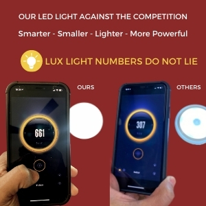 Note: The IOS app Light Meter was used to measure LUX light brightness in this comparison. Tested on 2/5/2021