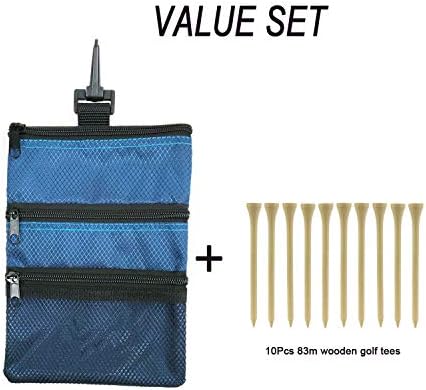 Amy Sport Golf Pouch Bag Multi Pocket Clip Zipper Hook to Bag, with 10 Pcs Wooden Golf Tees Value Set, Durable Nylon Valuables Holder for Men Women