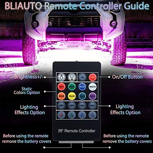【RF Remote Control Car Underglow Led Light】The RF Remote Controller can 360 degree sensing angle,control range up to 10 meters, sensitivity and stability,has 16 Scenarios Modes&8 Static Mode Control(Red Green Blue White Orange Yellow Cyan Purple)&4 RGB Dynamic Mode Control(2 Preset Jump and 2 Preset Fading Patterns)&4 Music Sound Active Mode Control.Makes your vehicle stand out in style.