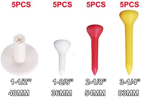 VALUE PACK – Included 5pc 1-1/2” Multi-function Rubber Tee, 5pcs 1-2/5” Plastic Golf Tees, 5pcs 2-1/8” Plastic Golf Tees and 5pcs 3-1/4” Plastic Golf Tees.