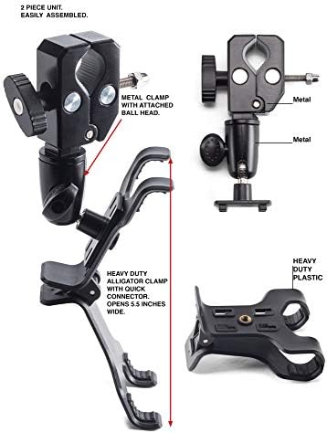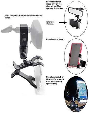 Clamptastick!- Version 3 is a quick connect 2-piece system that provides high quality components made from mostly metal and high grade plastic. The metal crab clamp with attached ball head can latch onto surfaces up to roughly 1.5 inches wide, which means when you tighten this clamp down, it will not fall off over time from heat or drying out. The Aluminum ball head is made to hold 5 LBs and provides 360 degrees of viewing while keeping your phone locked in place at any angle. The alligator clamp that holds the phone can be separated and used on your desktop for a video call or to keep your phone right in view. Whether you’re a professional driver, executive, college student, videographer/ photographer on the go mom, you’ll find there is an application where this clamp will serve you and exceed your expectations. Add this clamp to your cart and have a Clamp-tastick Day.