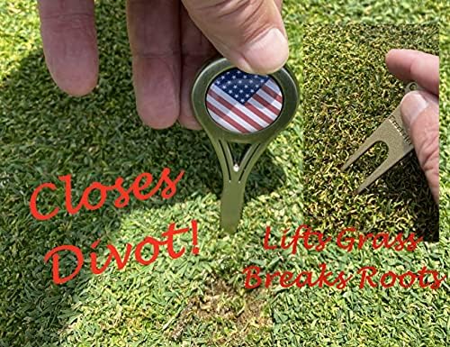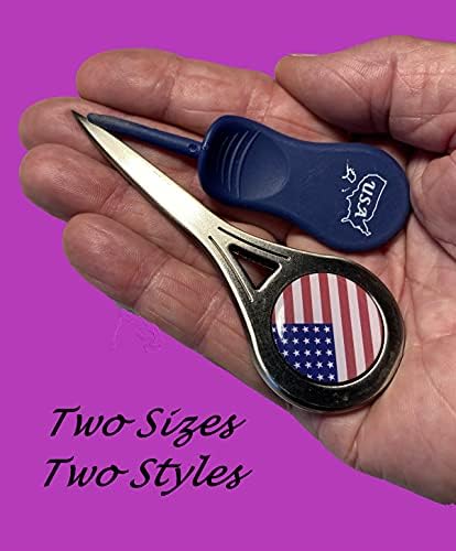 Expensive Looking Quality Divot Repair Tool with Second Free Plastic Divot Repair Tool and 14 Bonus Bamboo Wood Tees that are 2.75 inches long – Perfect size to hold Ball for any Driver. Great Gift for Men, Women and Kids. Main Divot Repair Tool comes with Personalized Patriotic American Flag Magnetic Ball Marker. So your Ball Marker is readily available to Mark your ball when you get to the Green. Slim Design fits in your pocket easily. Same is true of the Plastic Divot Repair Tool. Construction of the Primary Divot Tool is Durable Zinc Alloy with Metal ball marker. Blue divot tool is constructed of durable plastic. Both will last a life time. The style of both divot tools is a single pronged design allowing you to push the divot together, instead of lifting the divot like a lot of two pronged (fork) tools suggest. This saves on unnecessary damage to the green. Both tools are lightweight, and thus easy to carry. Both divot repair tools come with our 30 Day Money Back Guarantee. You will be satisfied with your purchase.