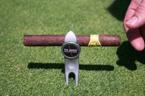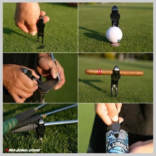 6 golf tools in 1: golf ball marker, divot tool, cigar holder, club head cleaner, golf grip saver, shotgun can opener