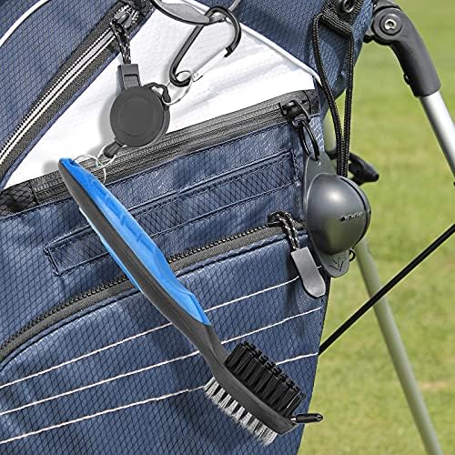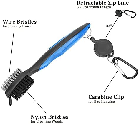 BRUSH-Extremely durable plastic handle, nylon bristles and aluminum carabiner. Retractable 2 ft zip-line carabiner makes it easy to attach to your golf bag. Wire bristles for quick and efficient cleaning of irons while on the fairway, Sharp pick for stubborn dirt and grime in grooves (Comes with plastic cover).