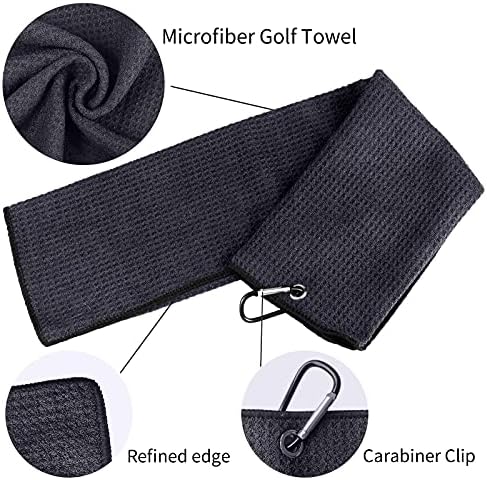 Favritt Microfiber Waffle Pattern Tri-fold Golf Towel Set|2 Golf Towel (Black/Navy) |Foldable Divot Tool with Magnetic Ball Marker| Golf Club Brush(4 Pack)