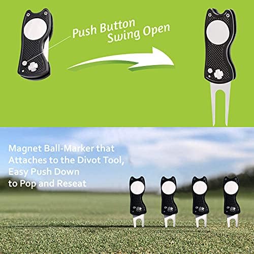 FOLDABLE DIVOT TOOL: Dimension 2 3/4 inch x 1 1/4 inch x 1/2 inch, avoid scratch in the pocket, Pop down button for easy unfolding. Full Metal with magnetic ball marker that attaches to the divot tool, easy push down to pop and reseat. Solid grip and feel.
