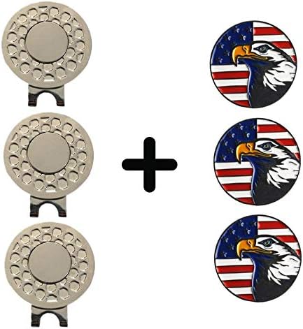 FINGER TEN Golf Ball Markers 3 Pcs with 3 Pack Hat Clip Value Gift Set, Mark Pattern USA, Eagle, Ribbon in Choice for Men Women Kid