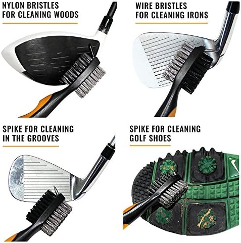 GOLF LIKE A PRO: Wire bristles for quick and efficient cleaning of irons while on the fairway and nylon bristles for easy cleaning of woods. Sharp pick for stubborn dirt and grime in grooves. This will help you make better contact. Each golf brush comes with its own cover to protect the bristles and pick.