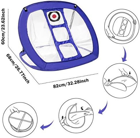 Really portable to carry thanks to the collapsible design.The golf chipping net measures 33’’(L) x 28’’(W) x 20’’(H) when unfolded and turns into a 13’’(Dia) flat circle when folding up.Ideal golf net for indoor outdoor use.