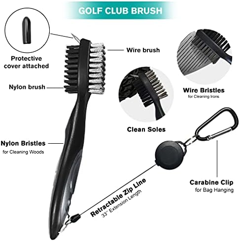 【Golf Cleaning Brush】Extremely durable plastic handle, nylon bristles and aluminum carabiner. The retractable 2 ft. zip-line carabiner makes it easy to attach to your golf bag for blazing fast access. Brush with cover helps protect your hand from hurt. Quick and efficient cleaning of irons while on the fairway, best cleaning tools for golf clubs and spikes, spike for cleaning deep in grooves and golf shoes.