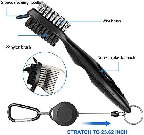 [Multifunctional Golf Club Brush] The extremely durable plastic handle reduces hand pressure and provides a comfortable feel under any circumstances. Golf club cleaning brush also has nylon and steel wire bristles for optional use, and a retractable 2-foot zipper carabiner for easy use Secure to your golf bag.