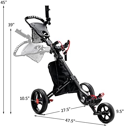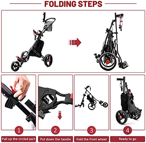 【FOLDABLE DESIGN】Our foldable golf cart can folded easily to compact size. The folding dimension is 18.5″ x 20.5″ x 33.1″. You can also take off the wheels in seconds to save storage room. It is easy to be stored in your trunk and will not take up too much space when not in use.