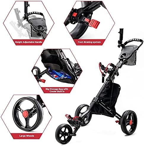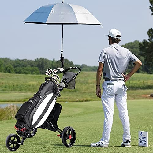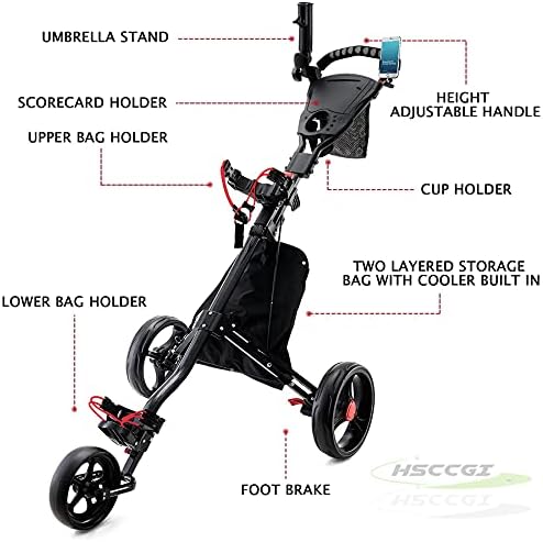 Golf Push Pull Cart, 3 Wheel Foldable Golf Pull Cart with Foot Brake, Height Adjustable Handle, Push Pull Golf Cart Trolley with Umbrella Holder, Cup Holder, Tee Holders, Scoreboard, Storage Bag