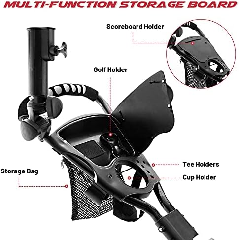 【VERSATILE GOLF CART】Our 3 wheel golf push pull cart boasts an attractive finish body and many thoughtful designs. It comes with an umbrella holder, a cup holder, a tee holder and a scoreboard on the handle, which can meet all your needs. The panel can also be opened to store you golf.