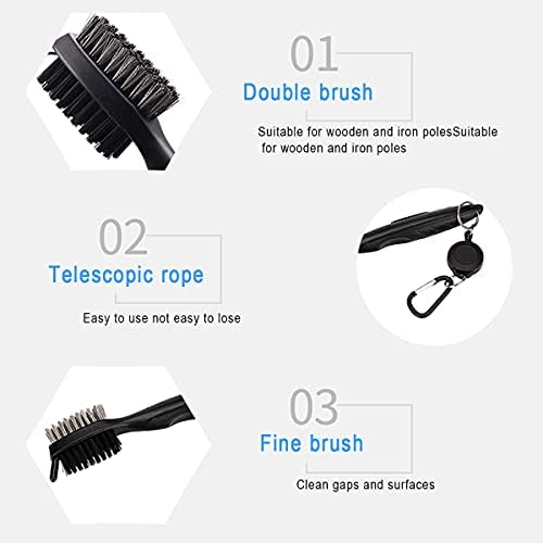 【Retractable Golf Club Brush】Our multipurpose cleaning golf brush with 2 Ft Retractable Zip-line Aluminum Carabiner, helps you clean clubs or shoes easily. Made of hard nylon bristles, with durable plastic handle and carabiner, our groove cleaner brush can be used for a long time without deformation.