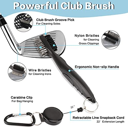 GOLF CLUB CLEANER – The golf club cleaner is equipped with a retractable 2ft zip-line aluminum carabiner and an ergonomic comfort fit durable handle makes it easy to attach to your golf bag for blazing fast access. Nylon bristles are used to clean dust and dirt/clutter. Wire bristles can quickly and effectively clean the irons on the fairway. Stainless steel sharp pin specialize can remove the most stubborn debris in the golf club groove. It can also be used to clean golf shoes.