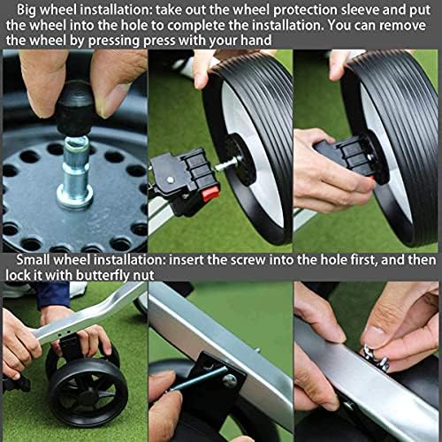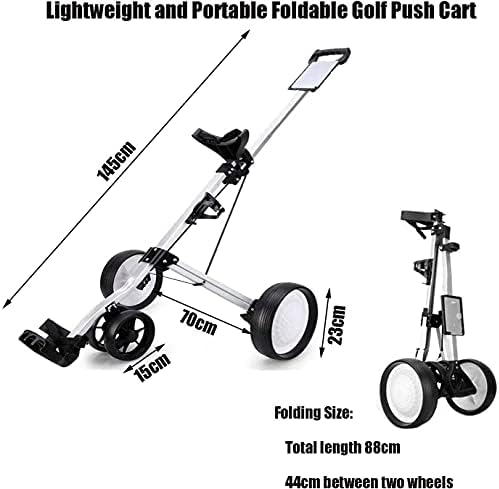 Easy to use: This collapsible golf push cart with quick-release wheels is easy storage; Folds in seconds with simple 2-step fold; The cart can be easy to transport easily