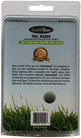 Take control of the tee box. GuaranTees Full Range golf tees are designed to give you the confidence needed to hit longer, straighter drives and more accurate tee shots, every time you play. Our assorted tee pack includes 3 1/4″ Long & Strong, 3 1/4″ Performance Height, 2 3/4″ Green, 2 3/4″ Pink, and 1 1/2″ Short & Stout tees. This package of combination tees includes several lengths and sizes – everything you need for an entire golf season. Made from recycled materials that are almost unbreakable, GuaranTees are USGA conforming, and engineered to be up to 50 times stronger than wooden tees. Try them the next time you play and see the difference. Made in the U.S.A., your satisfaction is 100% guaranteed, or your money back.