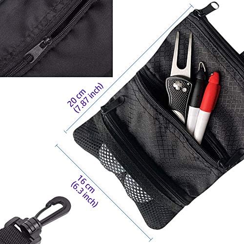 Good golf pouches bag- With 3 different compartments, 3 zippered pockets, which can store your golf balls, golf tees, brush, ball marker, hat clip, divot tools, valuables, and other accessories; with the swivel clip it’s easy to access pocket or clip on your golf bag to keep tees in. Thick fabric material with high quality zippers and clip.