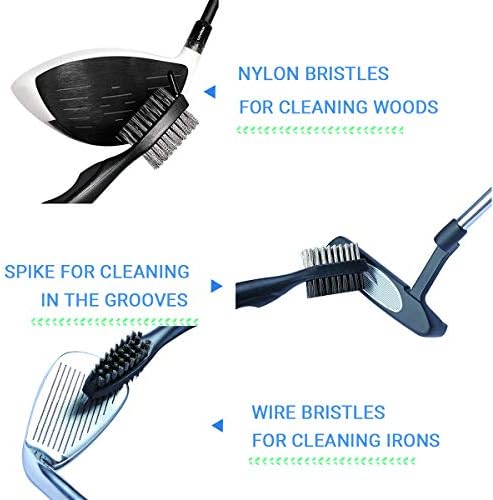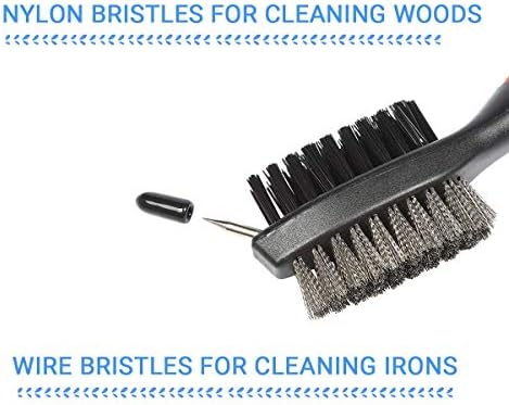 【Golf Club Cleaning Brush】Fit hand shape durable plastic handle. The golf club brush is designed with two bristles for quick and efficient cleaning. Sharp spike with protective cap for cleaning deep in the club grooves and golf shoes.Good golf club cleaner tool.