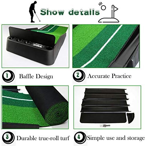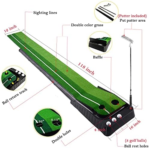 ⛳【Environmentally Friendly Simulated Turf And Extra-Long Lengths】The surface of the extended 118 inch length 12 inch width putting mat is constructed with imported high-quality two-tone grass.Deep green track designed has lower resistance than light green in order to practice your skill better. The bottom is made of unique non-slip rubber,which can bring you an realistic putting experience .With 10cm thickness of the base, enough height to provide enough practice slopes.