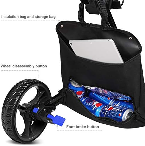 VERSATILE: Golf push carts beverage holder and Storage bags included.It also include Umbrella stand and Mobile Phone Selfie Stand. For maximum portability, this foldable golf cart also has ball wheels for smooth driving on any terrain. It only needs a light pull to engage and release the clicgear.It is the perfect golf bag cart.