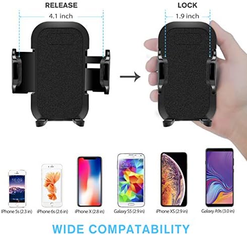 ONE BUTTON RELEASE: Just press the button on the back of the phone holder to release your device in seconds. Suitable for all 1.9″ – 4.1″ wide devices, such as iPhone XS/8/8 Plus/6 Plus, Samsung Note 8/9/s9 , HTC, GPS, etc.