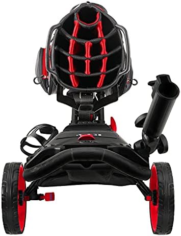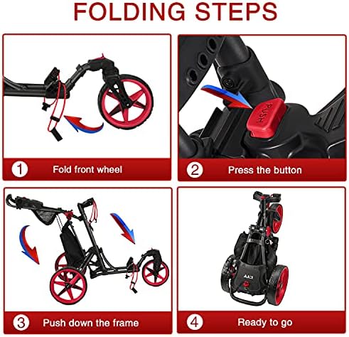 The cart comes with strong aluminum frame and 3 maintenance-free EVA cover wheels. It is equipped with deluxe scorecard holder, free umbrella holder, foot brake, and one-button fold mechanism.