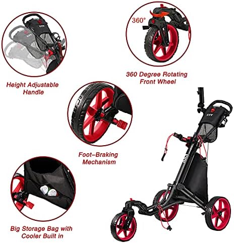 KVV 3 Wheel 360 Rotating Front Wheel Golf Push Cart Open and Close in ONE Second-Free Umbrella Holder Included