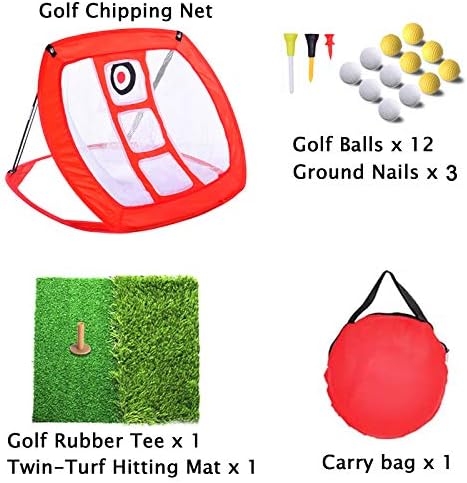 ⛳ Perfect Gift⛳: This set includes: a golf chipping net, a carry bag, a Twin-Turf hitting mat, 12 Pu golf balls, 3 ground nails and a Rubber Tee.Perfect gift choice for golf lovers.