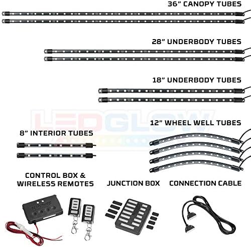 Includes (2) 28″ & (2) 18″ Flexible, Water-Resistant Underbody Tubes that House 84 SMD LEDs, (2) 36″ Canopy Tubes that House 66 SMD LEDS, (4) 12″ Wheel Well Tubes that House 48 SMD LEDs, (2) 8″ Interior Tubes that House 12 SMD LEDS, 12-Volt Powered Control Box, 2 Wireless Remotes, 12-Port Junction Box with 8 Port Plugs, Connection Cable, Self-Tapping Screws & Zip Ties