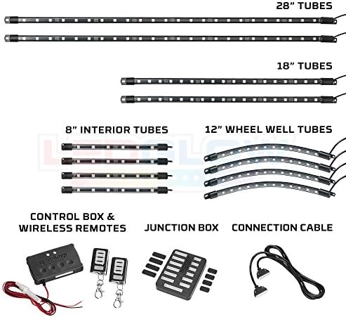 Includes (2) 28″ & (2) 18″ Flexible, Water-Resistant Underbody Tubes that House 84 SMD LEDs, (4) 12″ Wheel Well Tubes that House 48 SMD LEDs, (4) 8″ Interior Tubes that House 24 SMD LEDS, 12-Volt Powered Control Box, 2 Wireless Remotes, 12-Port Junction Box with 8 Port Plugs, Connection Cable, Self-Tapping Screws & Zip Ties