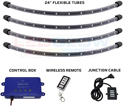 Includes (4) 24″ Flexible, Water-Resistant Underbody Tubes that House 48 SMD LEDs, 12-Volt Powered Control Box, Wireless Remote, 4-Port Underbody Tube Junction Cable, Self-Tapping Screws & Zip Ties