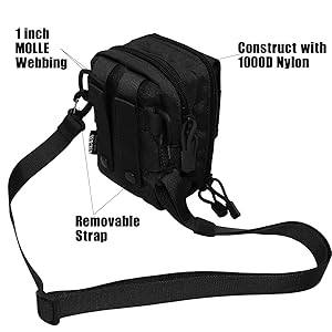 Which can be used as a waist bag to wear on belt, as a cross body shoulder bag(combo a detachable stap), it also can be attached to a backpack or vest with PALS due to the MOLLE compatible straps on the back.Ideal for outdoor recreation, mountain climbing, hiking, tourism, hiking, expedition adventure, fishing, cycling, hunting, you can use the LefRight MOLLE pouch to carry what you need.