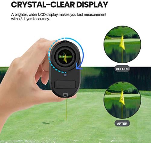 The lens of the Laser rangefinder is equipped with a 6x focal length, with which you can have a panoramic view of both near and far objects, even objects up to 100 0 yards. It also enable you locate flagpole easily in far distance.