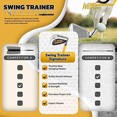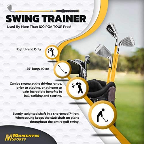 Momentus Golf Swing TrainerFeatures: * As you routinely swing the Momentus, your club will swing effortlessly along the correct path * The result will be longer, straighter and more consistent golf shots * You will ingrain a feel for swinging the club that is impossible to achieve by just hitting range balls * Use the Momentus: * At home swing the Momentus 10 to 15 times a day following the “Momentum Drill” to develop a consistent feel for swinging the golf club on-plane * On the driving range alternate swinging the Momentus 4 to 5 times with hitting range balls using a standard club. This will make the most out of your practice time * Prior to playing swing the Momentus to loosen up and reinforce the feel for swinging the club correctly * New training DVD will help you get the most out of your Swing Trainer Models: * Driver * Momentus Driver is evenly weighted throughout the shaft, so it swings easily along a balanced path * Great for developing a smoother tempo and better rhythm * Available in right-hand only * Mens model is 40″ in length and weighs 36 oz. * Signature Tour Iron * Heavier model of the Tour Iron * 35″ in length and weighs 48 oz. (8 oz. heavier than standard) * Tour Iron * Used by over 100 players on the PGA Tour * Club is uniquely balanced and swings effortlessly * Available in right- and left-hand * 35″ length and weighs 40 oz.Grip Options: * Standard – rubber Tour Wrap design * Training Grip – Pre-formed rubber gripA placesA hands inA correct position each time you swingA club