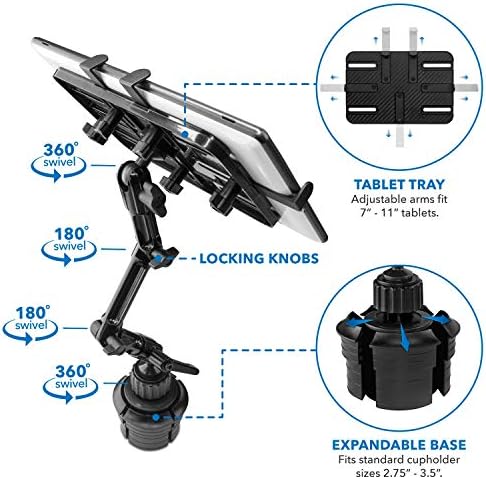 This universal tablet car cupholder mount allows you or your passenger to safely display or interact with a tablet while driving. The high-grade, durable aluminum arm securely holds your tablet while your car, truck, or van is on a road. Easy locking knobs at each joint ensures a strong and stable grip so your tablet won’t drift, sway, or sag even on the bumpiest drives. This vehicle mount is easily installed and removed from a car’s front seat or center console – no special tools necessary.
