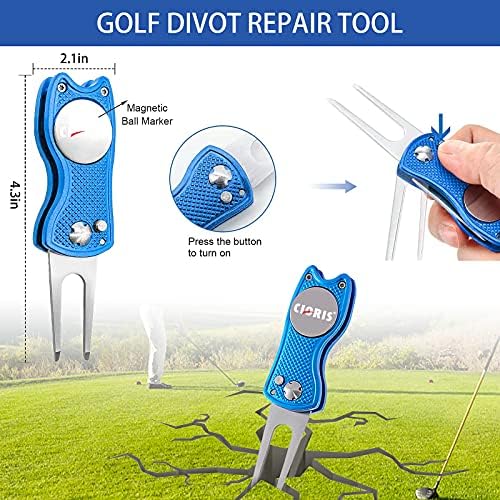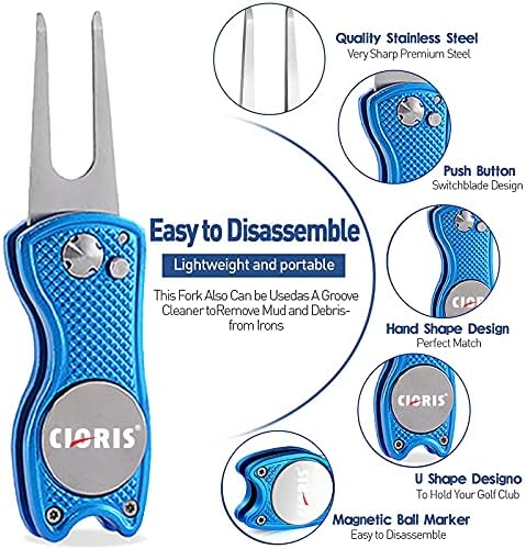 Golf Foldable Divot Tool: Dimension: 2.8×1.16×0.5in(Fold) 4.5X1.16X0.48in (Unfold). Convenience: It’s made of aluminium alloy, Made from High Quality Stainless Steel and Aluminum. .Small and lightweight, Easy to carry. Full Metal with magnetic ball marker that attaches to the divot tool, Start using as soon as you press the spring button and and reseat.