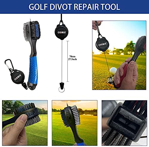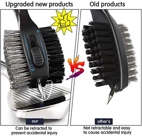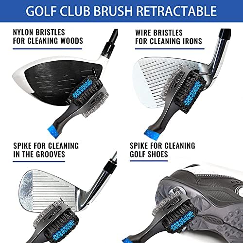 Golf Club Groove Cleaner Brush : Durable Clening Brush – The brush is designed with two bristles for quick and efficient cleaning. best cleaning tools for golf clubs and spikes,Wire bristle for the irons and the nylon bristle for the woods.And sharp spike with protective cap for the stubborn dirt and grime in grooves, also can be used to clean your golf shoes. 29.5” Retractable zip-line can be attached to the bag and easy for reach and use during the play,Lightweight and portable