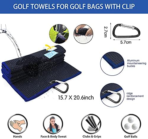 Golf Microfiber Towel: Tri-fold of 16”x23.6” using less space on the bag and easy for carrying.Microfiber with waffle design removes dirt, mud, sand and grass better than cotton towels. With a heavy duty aluminum clip/carabiner that conveniently attaches to your golf bag. Water Aborbency: Microfiber Material absorbs less water than cotton, easier to wash and carry.