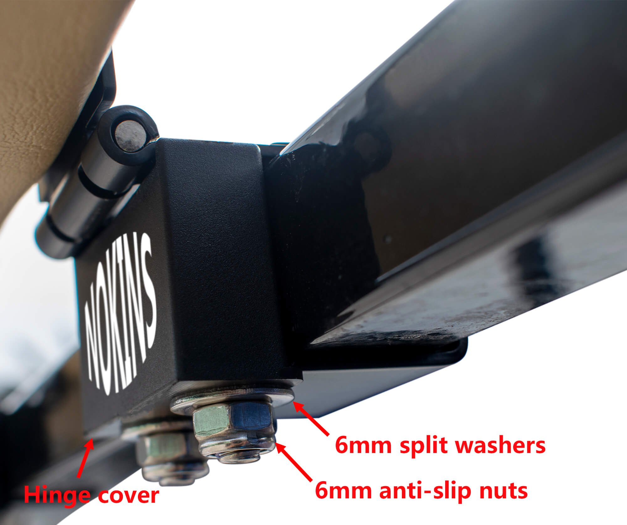 Put the hinge cover on the hinge before tightening the 6mm nut, As shown