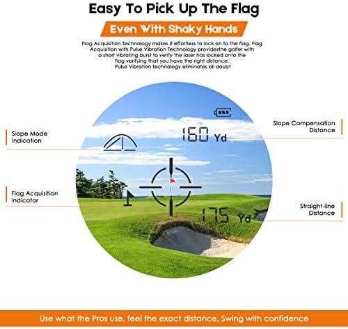 Flag Acquisition with Pulse Vibration Technology: Flag Acquisition Technology makes it effortless to lock on to the flag (even for those with shaky hands). Flag Acquisition with Pulse Vibration Technology provides the golfer with a short vibrating burst to verify the laser has locked onto the flag verifying that you have the right distance. With Pulse Vibration technology all doubt will be eliminated.