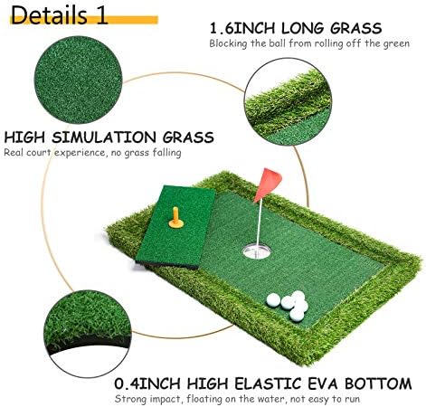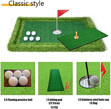 ⛳【Comes With Everything You Need】: golf putting mats Includ 24″x35″ Floating Golf Green,Pro-turf 8″x20″ Chipping Mat,5 floating Golf Balls,1 rubber tee,1 Flag.