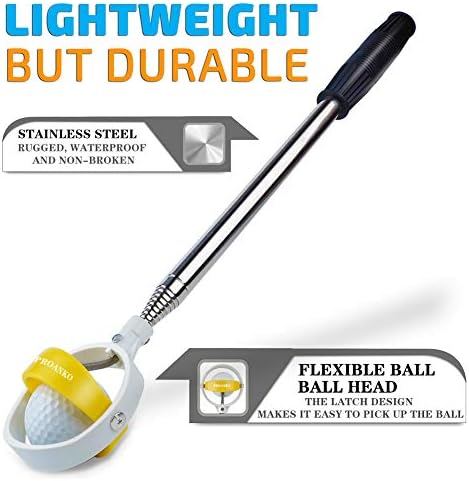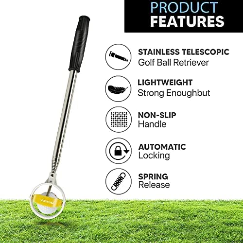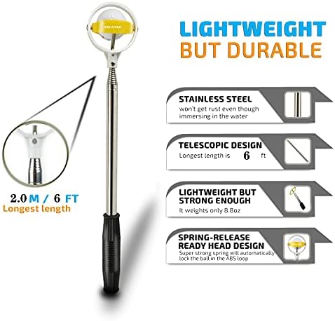The Golf Ball Retriever is an Easy-to-Use Golf Accessories. Spring release-ready head will automatically lock the ball in the yellow Nylon loop to prevent the golf ball from being dropped when retrieving.